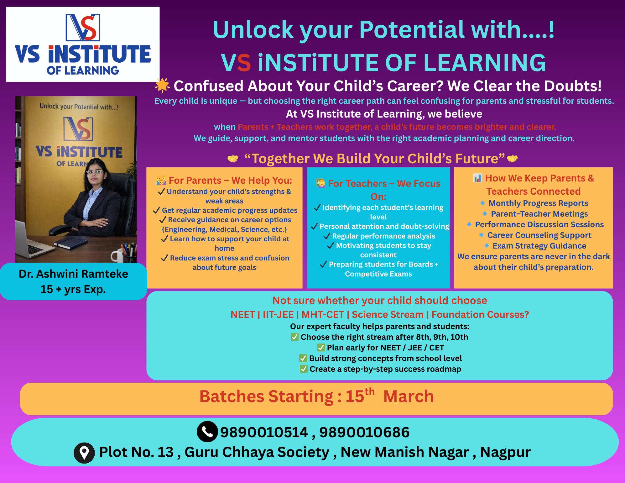 🌟 Confused About Your Child’s Career? We Clear the Doubts! Every child is unique — but choosing the right career path can feel confusing for parents and stressful for students. At VS iNSTiTUTE OF LEARNING, we believe when Parents + Teachers work together, a child’s future becomes brighter and clearer. We guide, support, and mentor students with the right academic planning and career direction. 🤝 Parent–Teacher Communication Program “Together We Build Your Child’s Future” A child performs best when parents and teachers are on the same team. That’s why we have a strong communication system to track progress, solve problems early, and guide students toward success. 👨‍👩‍👧 For Parents – We Help You: ✔ Understand your child’s strengths & weak areas ✔ Get regular academic progress updates ✔ Receive guidance on career options (Engineering, Medical, Science, etc.) ✔ Learn how to support your child at home ✔ Reduce exam stress and confusion about future goals 👩‍🏫 For Teachers – We Focus On: ✔ Identifying each student’s learning level ✔ Personal attention and doubt-solving ✔ Regular performance analysis ✔ Motivating students to stay consistent ✔ Preparing students for Boards + Competitive Exams 📊 How We Keep Parents & Teachers Connected 🔹 Monthly Progress Reports 🔹 Parent–Teacher Meetings 🔹 Performance Discussion Sessions 🔹 Career Counseling Support 🔹 Exam Strategy Guidance We ensure parents are never in the dark about their child’s preparation. 🎯 Career Guidance & Academic Planning Not sure whether your child should choose NEET | IIT-JEE | MHT-CET | Science Stream | Foundation Courses? Our expert faculty helps parents and students: ✅ Choose the right stream after 8th, 9th, 10th ✅ Plan early for NEET / JEE / CET ✅ Build strong concepts from school level ✅ Create a step-by-step success roadmap 💬 Our Promise to Parents “At VS iNSTiTUTE OF LEARNING, your child is not just a student — they are a future doctor, engineer, scientist, or achiever in the making.” With regular communication, expert guidance, and strong parent involvement, we help students move confidently toward their goals. 📍 VS iNSTiTUTE OF LEARNING Where Parents, Teachers, and Students Work Together for Success 📞9890010514 , 9890010686 📍Plot No. 13, Guru Chhaya Society , New Manish Nagar , Nagpur 🎓 JOIN OUR FREE DEMO BATCHES 📅 Starting 15th March Give your preparation the right start with expert guidance at 🌟 VS iNSTiTUTE OF LEARNING